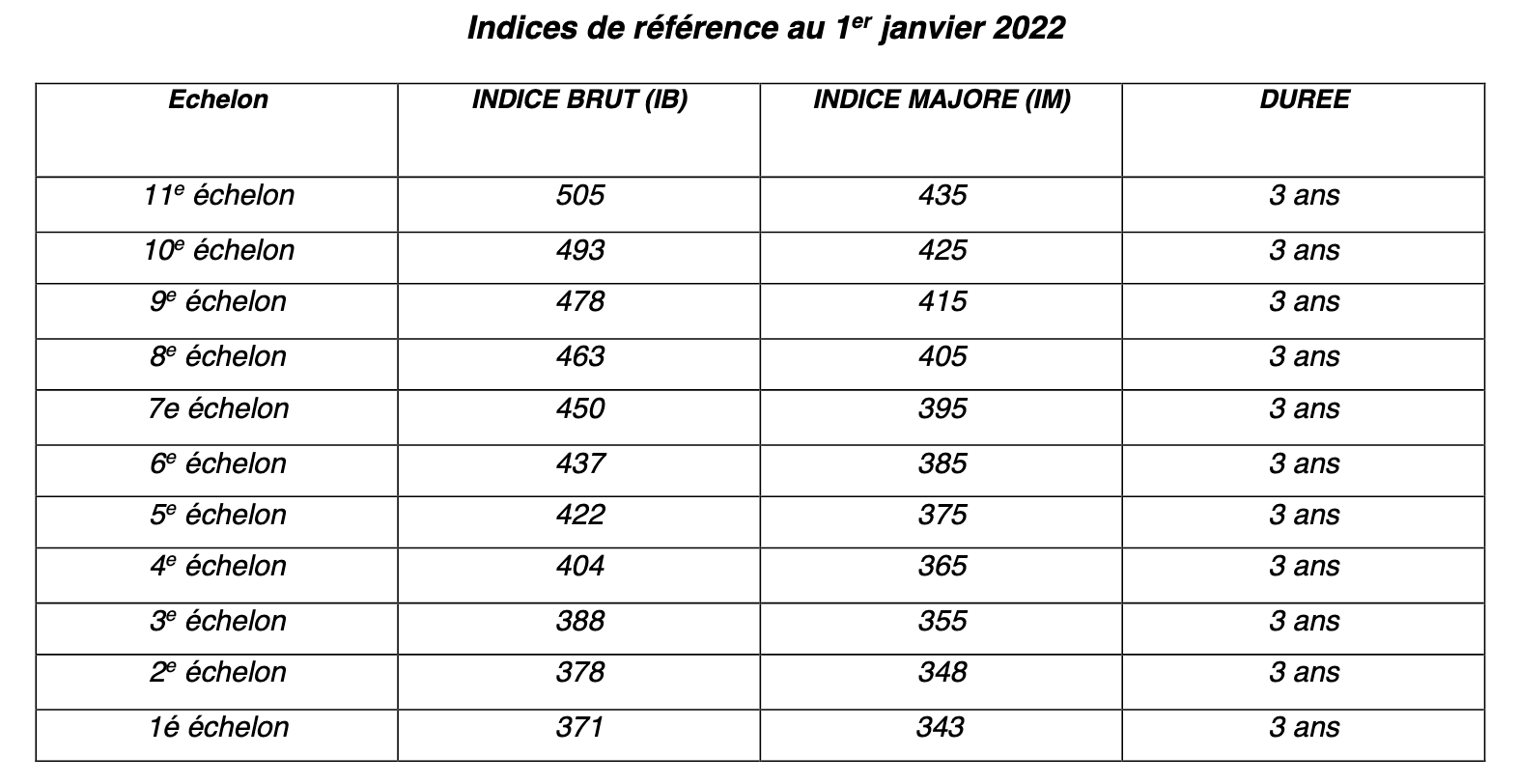 | Échelon | Indice Majoré (iM) | Durée |