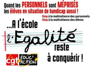 La CGT Educ’action revendique la nécessité de valoriser les personnels qui accompagnent les élèves en situation de handicap et de repenser le système scolaire pour que l’ensemble des enfants présent·es sur le territoire puisse bénéficier des apprentissages scolaires.
