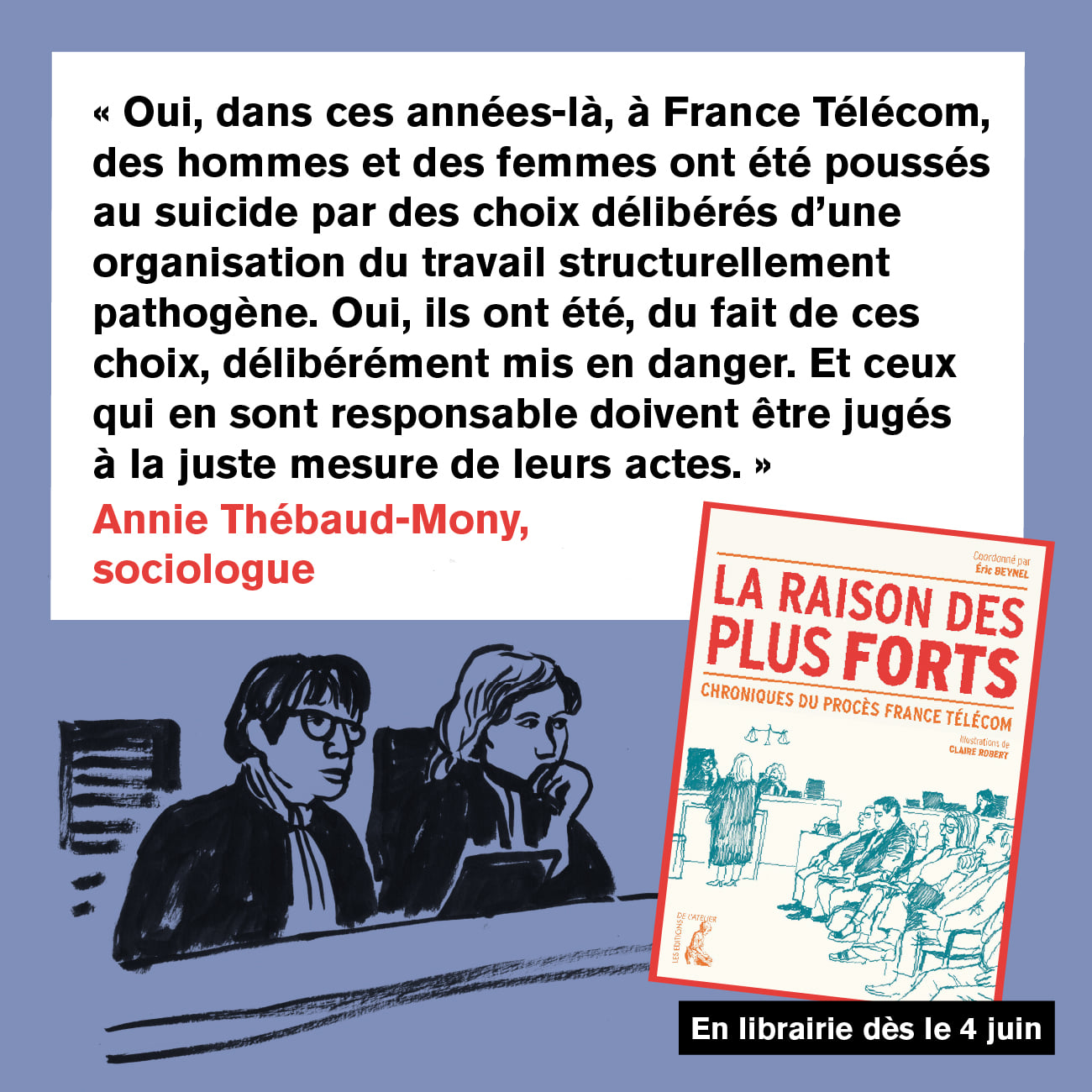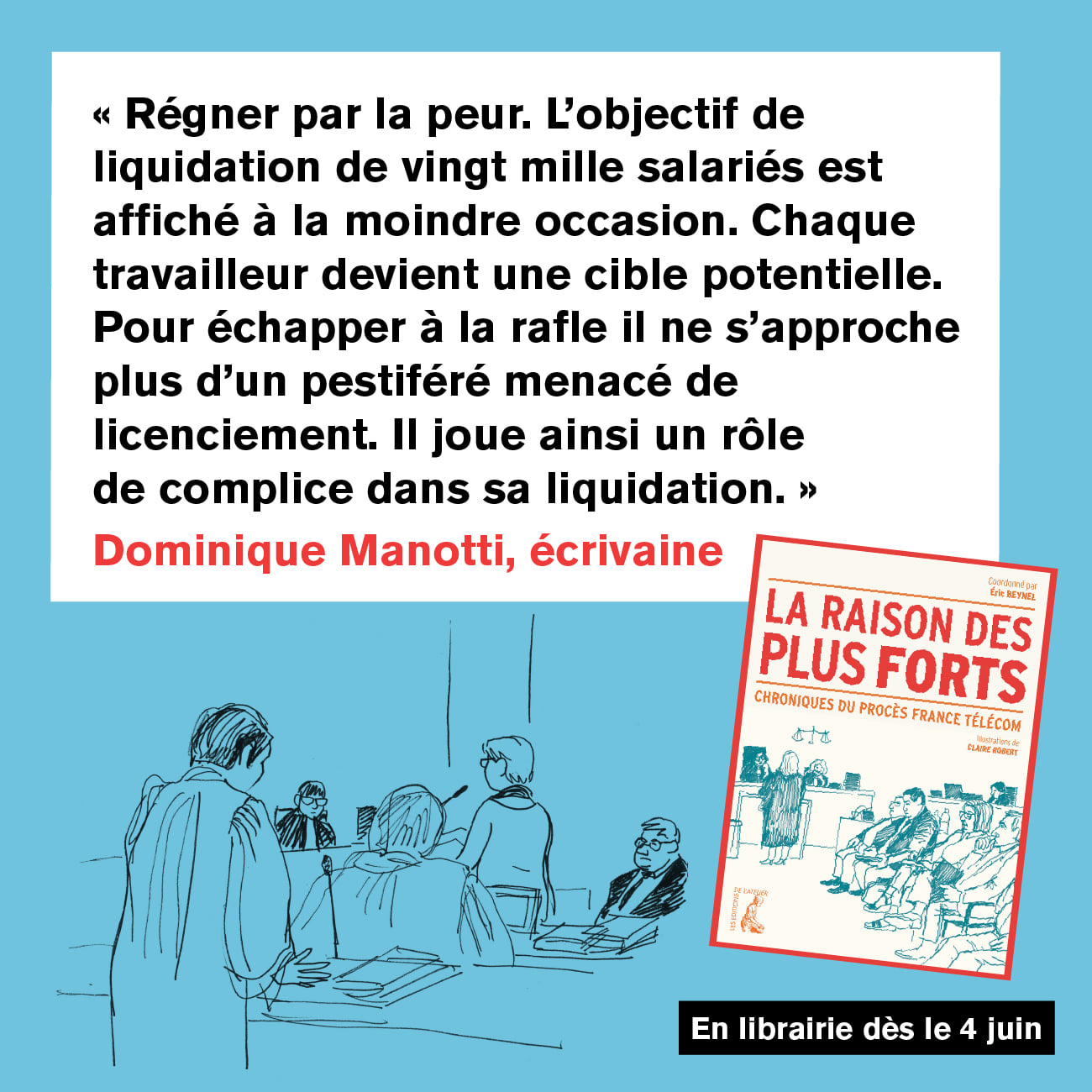 Porte-parole de Solidaires, Éric Beynel a lancé une démarche éditoriale inédite de suivi du procès, conviant chaque jour une personnalité (romancier.ère, chercheur.se., artiste) à rédiger ou dessiner un récit d’audience. Chaque texte constitue un épisode haletant, une plongée dans l’espace ritualisé, tragique, du tribunal. L’ensemble de ces chroniques est réuni dans un livre « La raison des plus forts » aux éditions de l’Atelier.